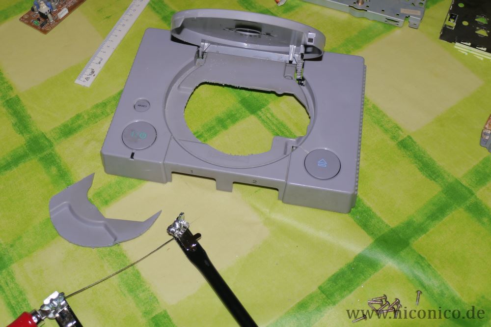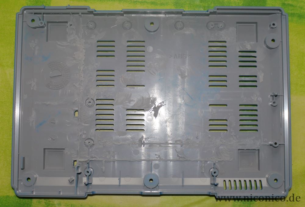 Zunächst sind erstmal die ganzen Plastikteile interessant. Wir haben da die Ober- und Unterschale und das Frontstück mit den Controlleranschlüssen. Da ich das Gehäuse unbedingt neu lackieren wollte, habe ich mir Kunststoff-Grundierung und Farblack besorgt. Vor dem Lackieren gab es aber noch ein paar Sachen zu tun. Ich habe das Loch, das unter dem Deckel durch den Ausbau des CD-Laufwerkes entstanden ist, vergrößert. Dafür kommen mehrere Werkzeuge in Frage, ich habe es mit einer Laubsäge und einem Dremel mit Bohrer versucht und beide Varianten haben gut funktioniert.