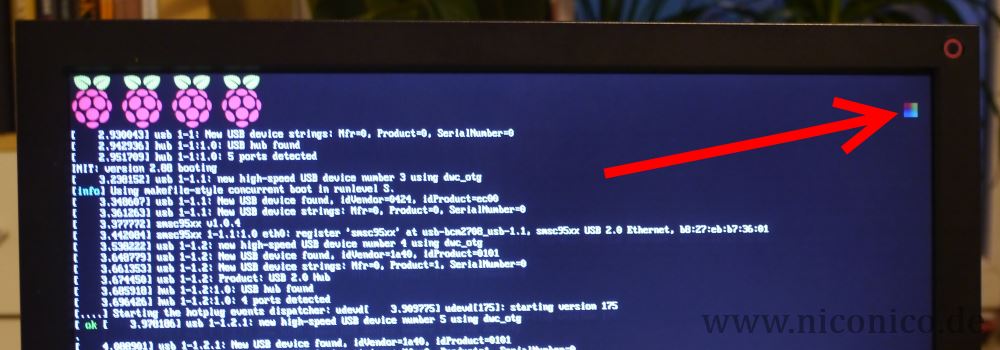 Was die Stromversorgung angeht, habe ich viel rumprobiert. Zunächst hatte ich nur den Pi2 mit einem 5V 2A Netzteil und habe den Controller, Tastatur, Maus und Soundkarte direkt an die vier USB Buchsen des Raspberry angeschlossen. Das fand der mitunter nicht so toll und das resultierte dann bei mir u.a. darin, dass der Controller manchmal lustig blinkerte und nicht richtig oder machmal garnicht funktionierte. Glücklicherweise zeigt der Raspberry Pi 2 beim Booten an, wenn er Probleme mit der Stromversorgung hat. Dann erscheint in der rechten oberen Ecke des Bildschirms ein farbiges Quadrat.