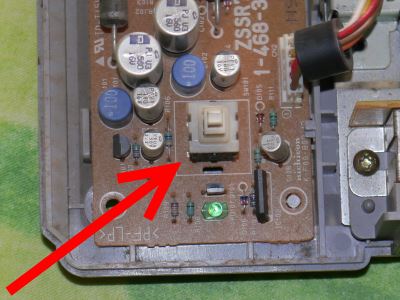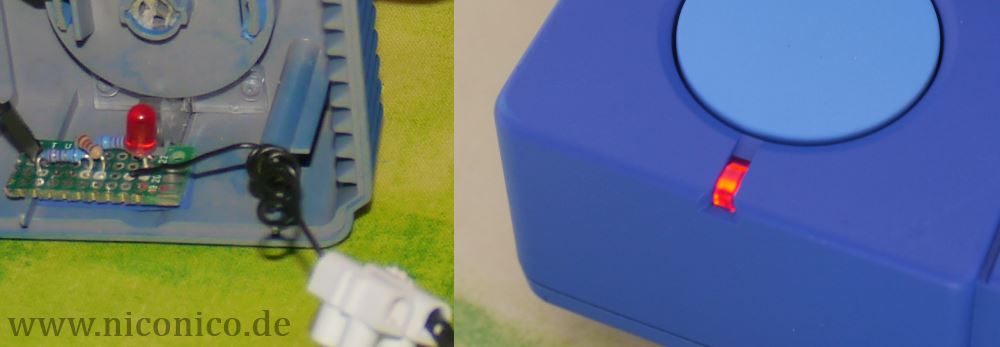 Das Playstation-Gehäuse hat eine kleine LED, die leuchtet, wenn das Gerät eingeschalten ist. Die soll natürlich auch mit dem Raspberry funktionieren! Leider ist es nicht ganz einfach, die originale LED von der Platine runterzubekommen. Also habe ich das gelassen, ich wollte sowieso eine andersfarbige Leuchtdiode nehmen.