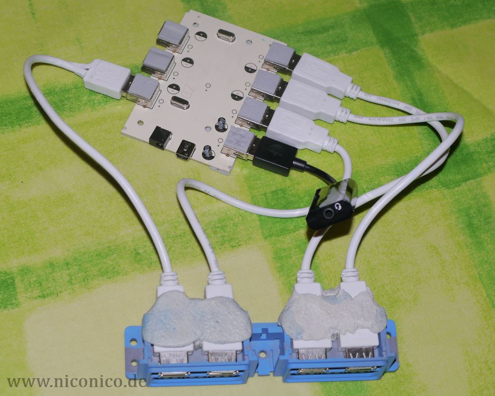 Die vier USB-Stecker wurden ebenfalls mit dieser Powerknete fixiert. Für das Audio-Verlängerungskabel gibt es am Gehäuse keinen passenden Ausgäng, deswegen habe ich mit einem 6mm Bohrer ein Loch gebohrt in den Deckel direkt über dem AC IN Anschlussloch, wo die Audiobuchse nun perfekt reinpasst.