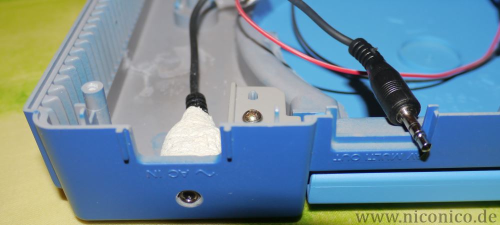 Die beiden Buchsen für die Poweranschlüsse passen sehr gut nebeneinander in das Loch des AV MULTI OUT Ausgangs des Gehäuses. Die Netzwerkverlängerung passt hinter das AC IN Loch, wenn man ein bißchen mit Dremel und Feile nachhilft (das Loch ist groß genug, aber von der Buchse muss man ein bißchen Gummi abhobeln). Diese Anschlüsse habe ich auch mit der Knete fixiert.