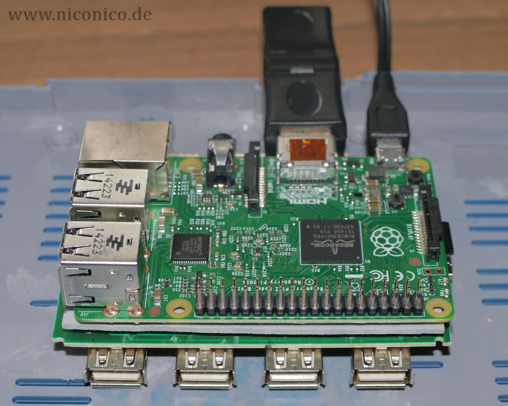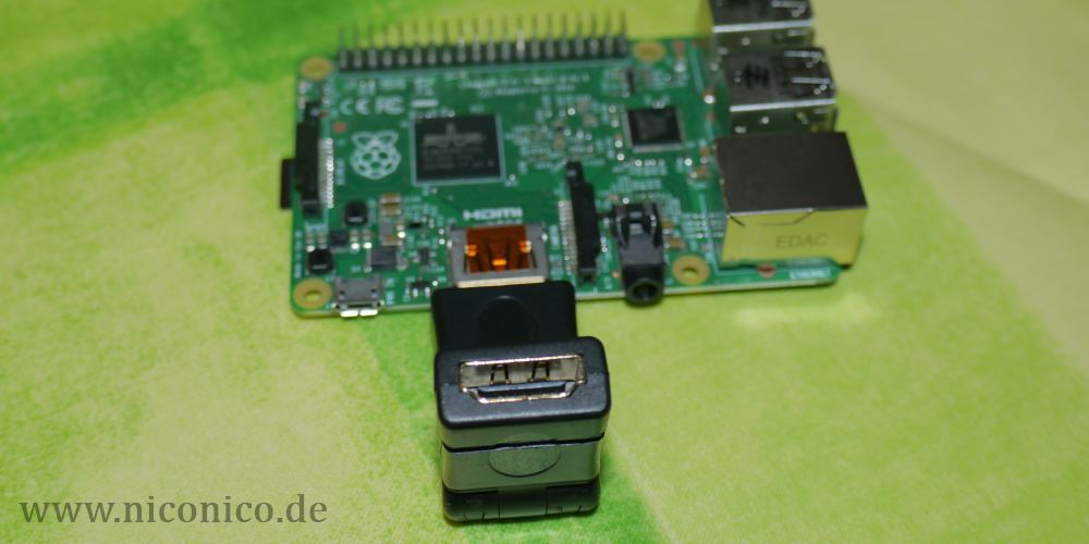 Damit nichts kaputt geht, habe ich etwas Moosgummi zwischen Hub und Pi gelegt. Der Hub wird über den Micro-USB-Anschluss mit einem USB-Anschluss des Raspberry verbunden, da reicht auch ein sehr kurzes Kabel.
