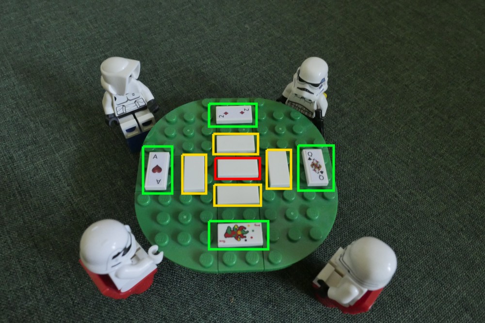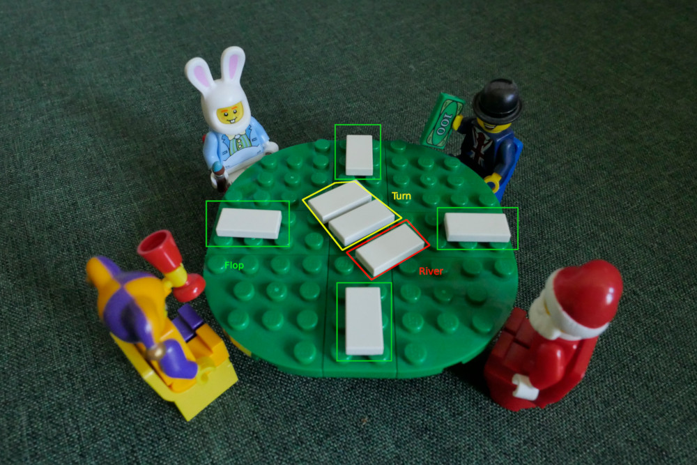 bis zwischen allen Spielern ein verdeckte Karte liegt (grün). Auf dem Flop werden dann diese Karten aufgedeckt. Für jeden Spieler gilt dann nur die links und rechts von ihm liegende Karte als Gemeinschaftskarte (die anderen gelten nur für andere Spieler). Auf dem Turn werden zwei Gemeinschaftskarten in die Mitte gelegt, die für alle Spieler gelten. Auf dem River wird eine Gemeinschaftskarte in die Mitte gelegt, die für alle Spieler gilt.