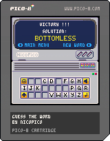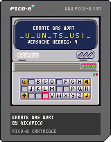 Hier mein erstes kleines PICO-8 Spiel, ein einfaches Wortratespiel à la Galgenraten.